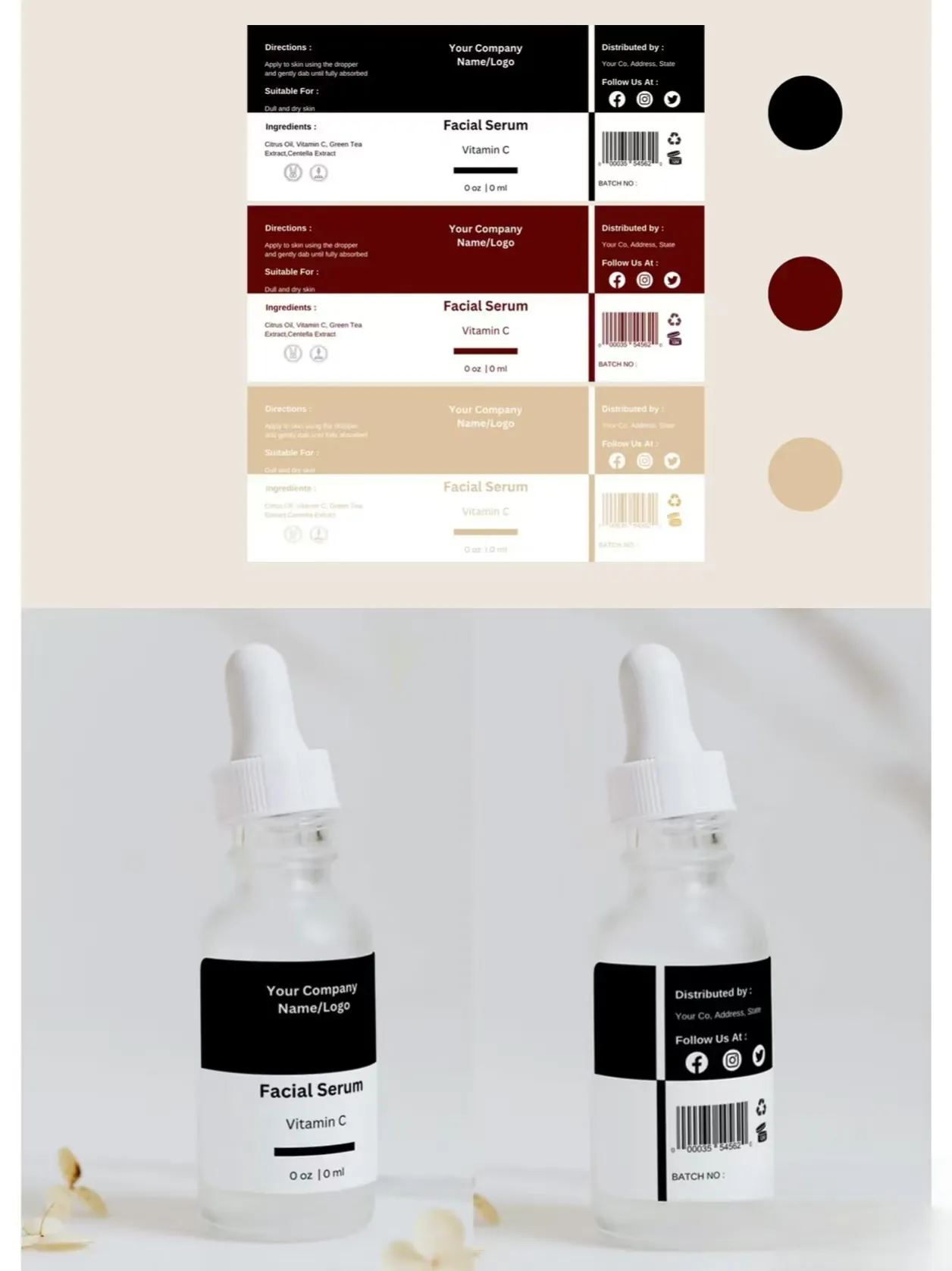 Израђене од разноврсног асортимана врхунских материјала, етикете за флаше од 20 мл укључујући водоотпорни сјајни винил, мат папир, еколошки прихватљив крафт папир и провидни филм.ЈОЈО Пацк’сЕтикете за флаше од 20 млмогу се похвалити јаком лепљивошћу, отпорношћу на огреботине и влагу и глатком завршном обрадом која обезбеђује јасно штампање логотипа, информација о производу, листе састојака и упутства за употребу. Подржавамо ЦМИК штампање и специјалне процесе као што су штанцање златном и сребрном фолијом, УВ премаз и утискивање како би се задовољиле потребе различитих брендова. Са прилагођеним величинама и без грешака при постављању, ове етикете су савршено решење за паковање како би се ваши производи од 20 мл истакли на конкурентном тржишту.