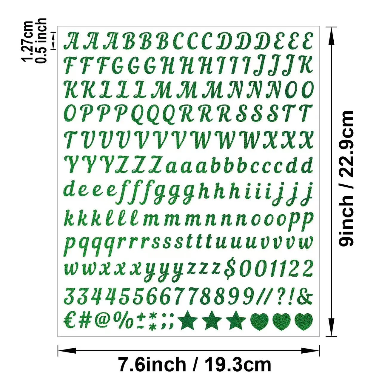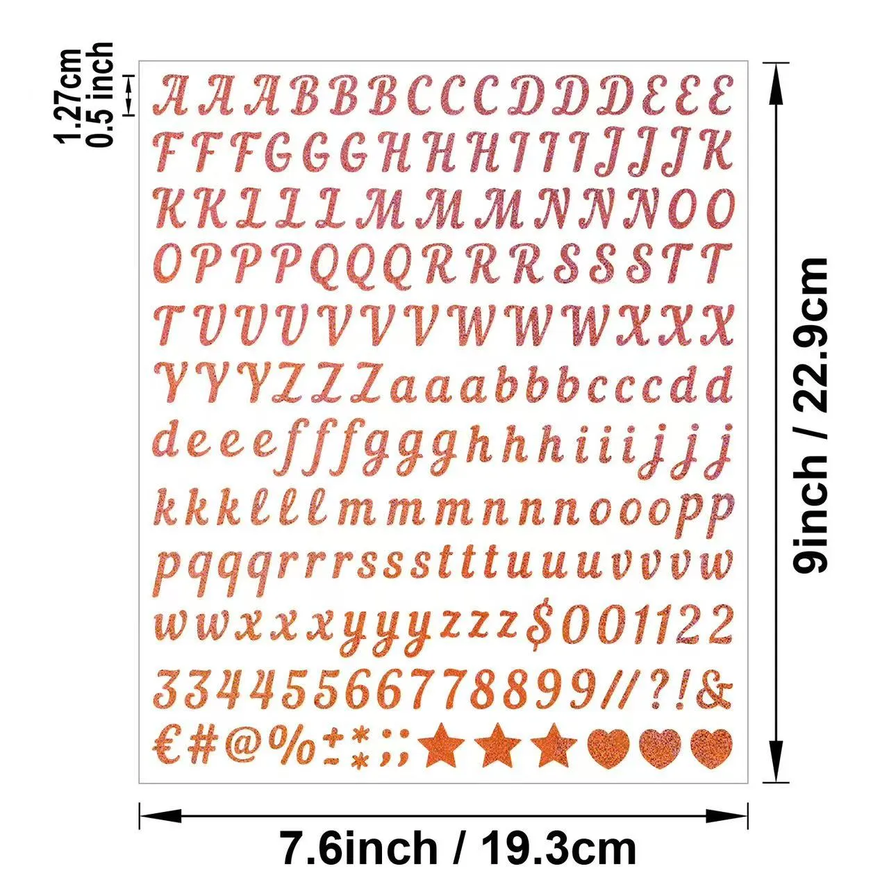 Ова декоративна налепница са писмом је креативни украсни предмет посебно дизајниран за „уради сам“, свакодневну декорацију и сценарије етикетирања. Комплетан сет укључује 26 великих енглеских слова, 0-9 бројева и уобичајене симболе, који задовољавају различите потребе за правописом, нумерисањем и декорацијом. Израђена је од дебелог и квалитетног материјала за налепнице, са сигурно затвореним слојем песка, лако се одваја и чврсто лепи. Погодан је за различите глатке и равне површине и не оставља трагове када се уклони.