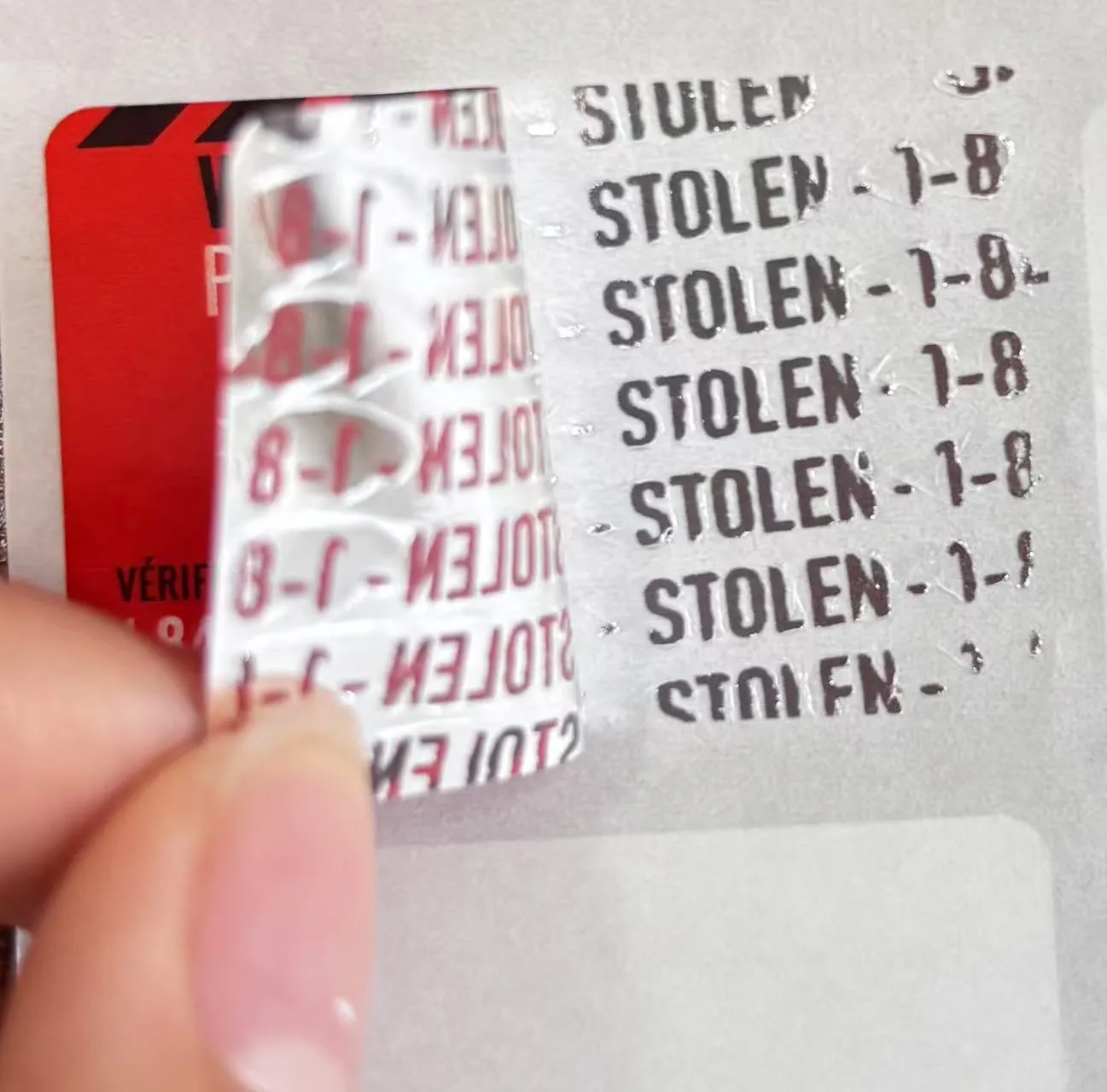 3. Откривена подршка за подстицање анти-фалсификовања:То је такође једнократна налепница против неовлаштености. Када се отвори налепница, одређени образац или текст остаће на доњем слоју, што указује да је налепница отворена и спречавајући да се поново употребљава, додајући додатни слој сигурности производа. На пример, након што се отвори, може приказати речи "Отворене" или узорак специфичан за бренд.