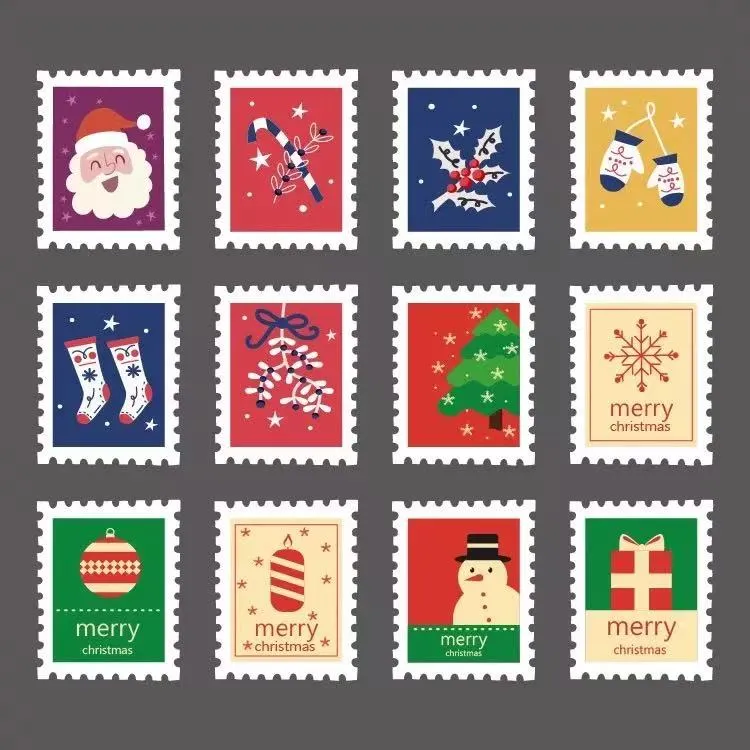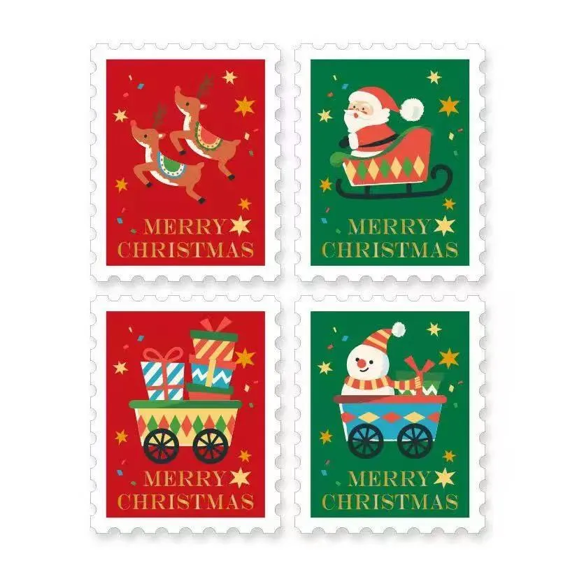 Налепнице за божићне марке Јоје Пацк-а имају ретро божићну карту као позадину, показујући различите налепнице на печат. Ивице имају перфорирани ефекат, дајући класичан и носталгичан изглед.