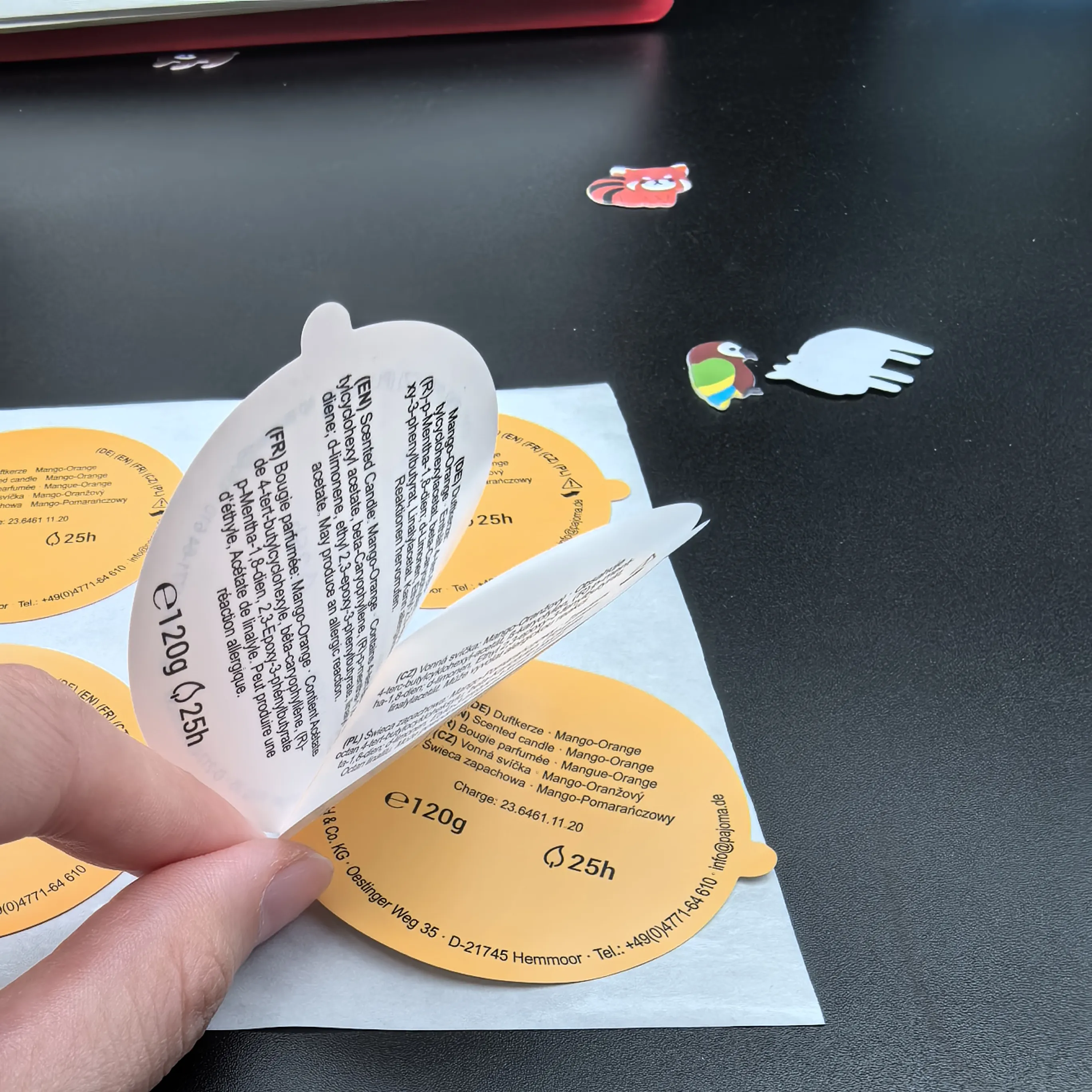 Вишеслојне етикетесу као "сендвич", састављени од 2-3 слоја налепница спојених специјалним лепком. Сваки слој је обично независан и лако се одлепи. Први слој одвишеслојна етикетапоставља се на површину. Када га корисник подигне, може да види садржај следеће странице. Доњи слој има самолепљиву површину, која се може залепити на производ. Сваки слој има посебан лепак.