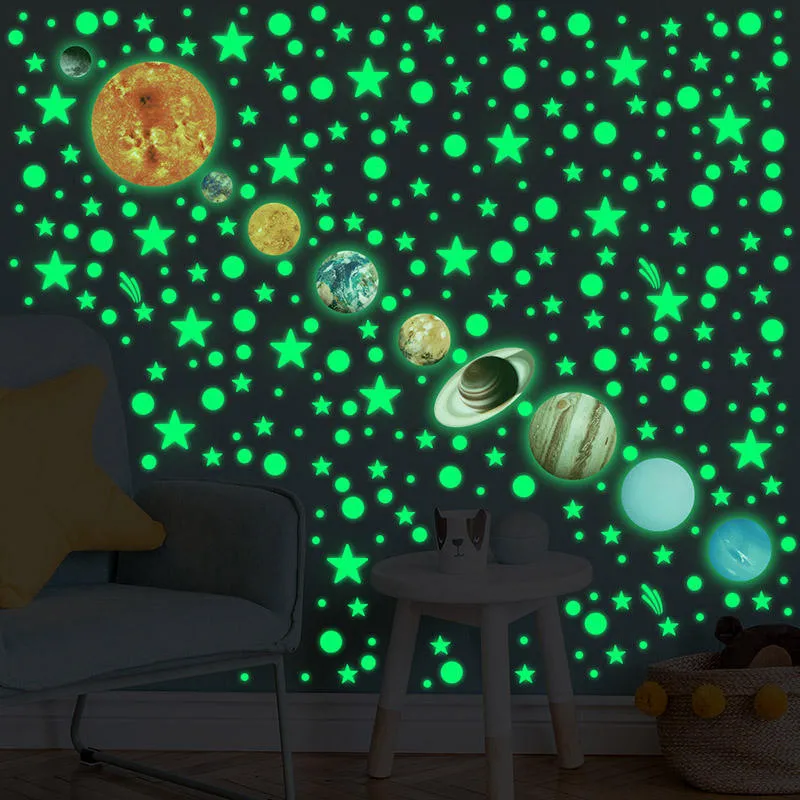 Када се електрони у лунасним материјалима врате у стабилну државу, они отпуштају претходно апсорбирану енергију, што је праћено емисијом фотона. Ови фотони су видљива светлост коју можемо видети. Пошто светлосне налепнице садрже велику количину таквих луминесцентних материја, они заједно раде на слободно ослобађање слабе светлости, омогућавајући налепницама да блистају у мраку.