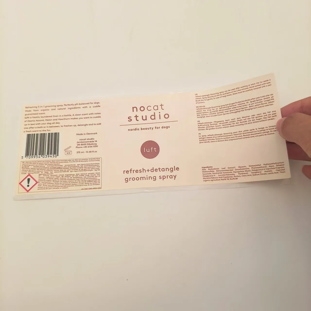Компанија ЈоЈопацк посебно је дизајнирала решење за налепнице за врхунску ознаку за клима за кућне љубимце. Наше наљепнице боца за распршивање је направљена од водоотпорне и отпорне на суза, а налепница производа може да одржава светлу и трајну боју чак и у влажном окружењу. Етикета садржи информације као што су назив производа, састојке, безбедносна упутства, функције и мере предострожности и уређени су на уредан начин који помаже бренду да побољша своју визуелну конкурентност.