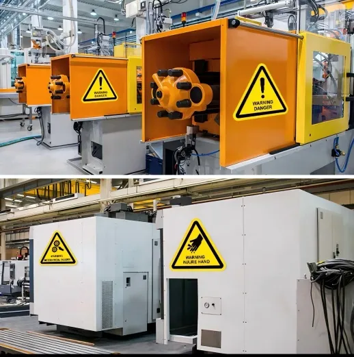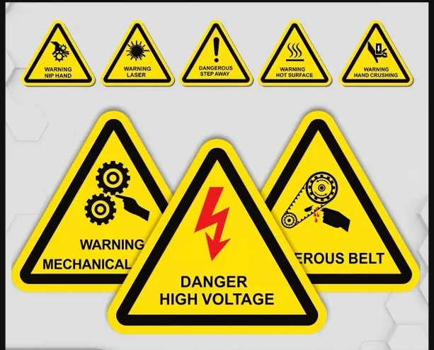 2. Ознаке упозорења на радном месту:Поставља се у фабричким радионицама, градилиштима, лабораторијама и сл., упозоравајући на опасности у специфичним радним окружењима, као што су налепнице „Машински рад, пазите на безбедност“ у радионицама и „Рад на великој висини, носите заштитну кацигу“ на градилиштима.