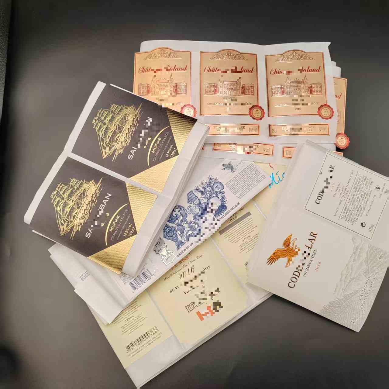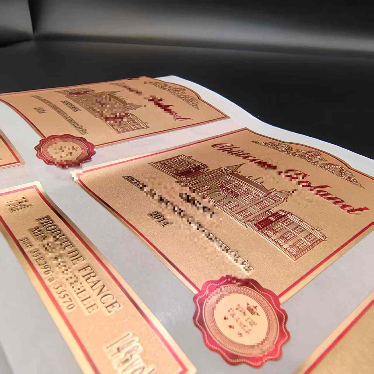 Налепнице за боце вина су направљене од висококвалитетног ПВЦ материјала, прилагођене ПВЦ водоотпорне позлаћене етикете за вино имају одличну отпорност на воду и влагу.